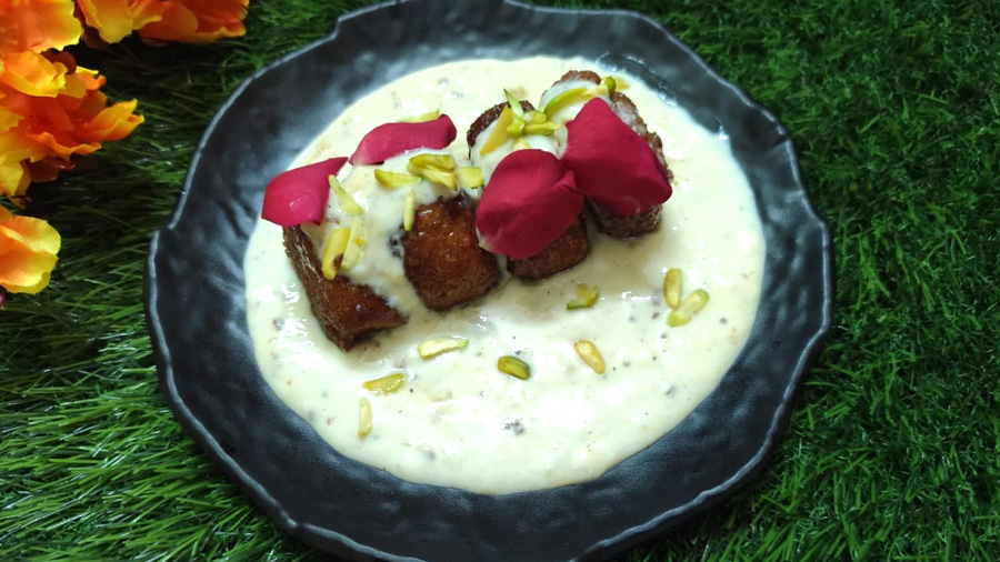 এরপর ধারালো ছুড়ির সাহায্যে গোল গোল করে কেটে নিতে হবে। এরপর গ্যাসে কড়াই বসিয়ে পরিমাণ মতো ঘি গরম করে পিন হুইল গুলো মিডিয়াম ফ্লেমে লাল করে ভেজে নিতে হবে। অন্যদিকে অন্য একটি পাত্রে দুধ জ্বাল দিতে হবে। ১ লিটার দুধ যখন ১/২ লিটার হয়ে যাবে সেই সময় দিতে হবে স্বাদমতো চিনি ও গুড়ো দুধ। এরপর ৫-৭ মিনিট পরে দিতে হবে এলাচের গুড়ো আর গোলাপ জল। এরপর গ্যাস বন্ধ করে রাবড়ি টা হালকা ঠান্ডা করে নিতে হবে। এরপর একটি পাত্রে প্রথমে রাবড়ি দিতে হবে তারপর দিতে হবে পিন হুইল গুলো। এরপর ওপর থেকে পেস্তা ও আমন্ড কুঁচি আর গোলাপের পাপড়ি দিয়ে সাজিয়ে দিলেই তৈরী হয়ে যাবে ‘পিন হুইল শাহি টুকরা’।