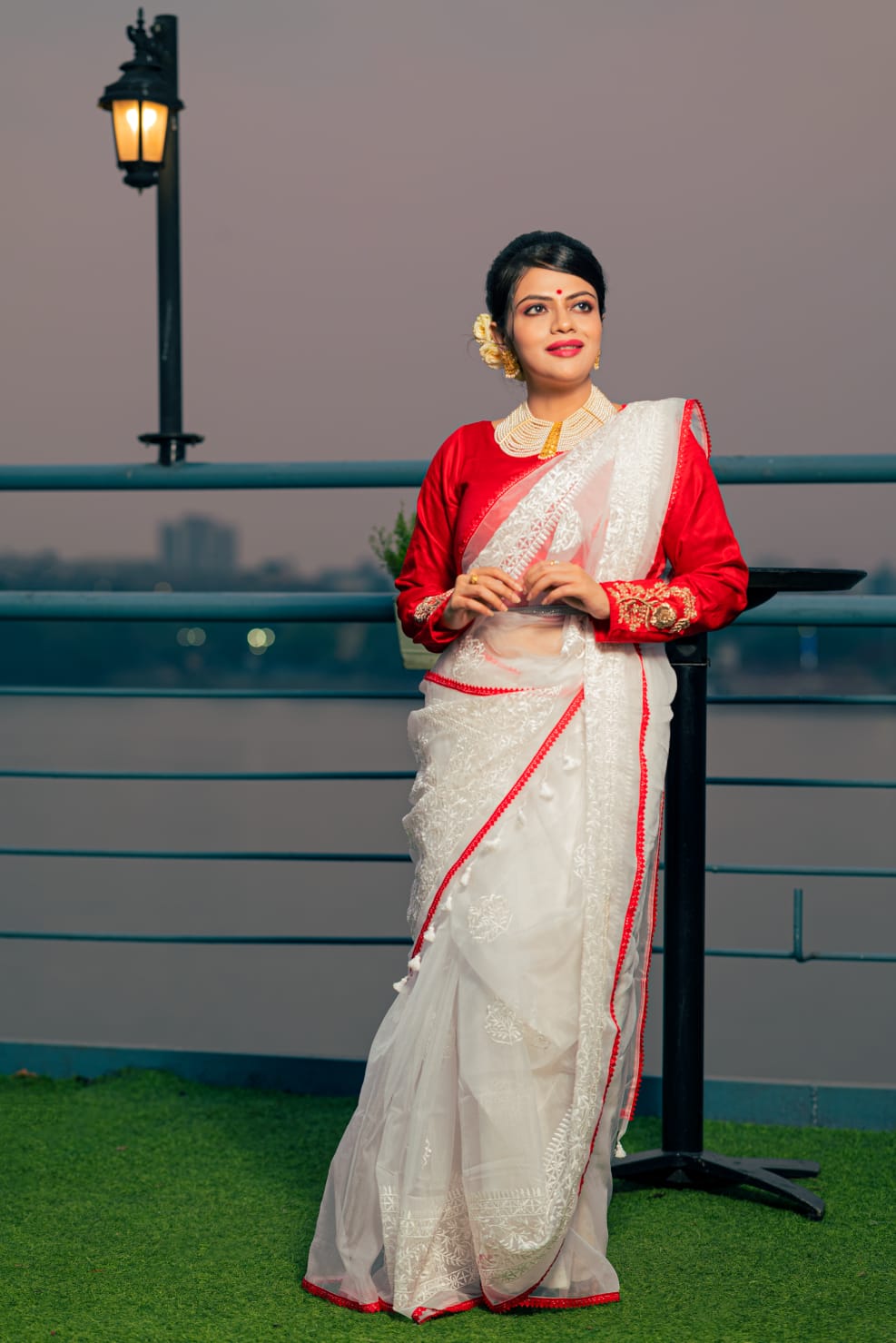 লাল-সাদা অর্গানজা শাড়ির সাথে সাদা রংয়ের সেলফ চিকনের কাজ সঙ্গে তসরের লাল ফুলহাতা ব্লাউজ আপনাকে করে তুলবে অনবদ্য। এর সাথে র-সিল্ক সাদা পাঞ্জাবি ও লাল-হলুদ রঙের ধুতি একবারে অন্যরকম।
